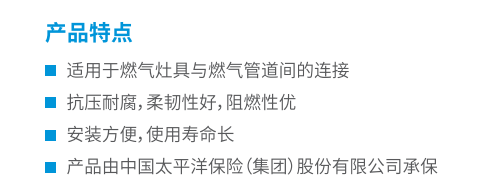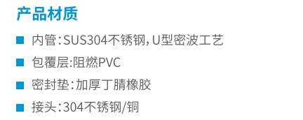 产品采用304不锈钢编织制造,不易老化、不易脱落、使用寿命长,管外面包覆层为阻燃PVC管,内管为NBR阻燃内管