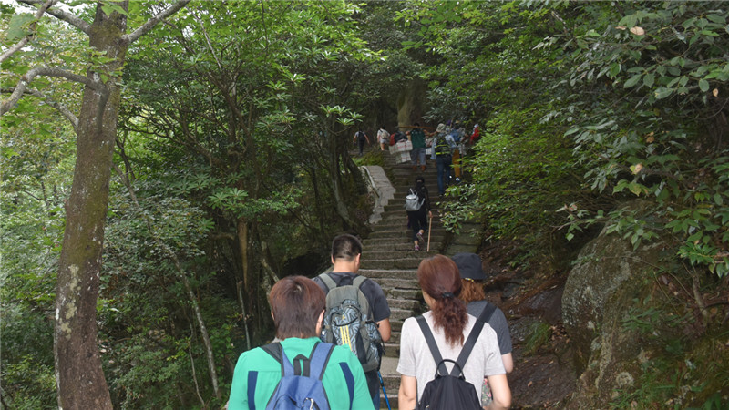 登山的人不少,有老人,小孩,中年人,少年,三五成群,目光中闪烁的是那份坚定,像是去朝拜的虔诚信徒。青山秀水,应与诗词歌赋,香茗妙音为伴,岂不为人生一大快事!
